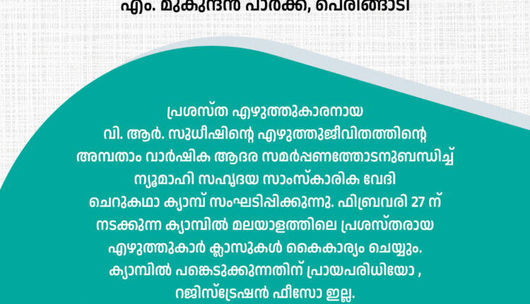 മയ്യഴി : എഴുത്തുകാരനായ വി.ആർ. സുധീഷിൻ്റെ എഴുത്തുജീവിതത്തിൻ്റെ അമ്പതാം വാർഷിക ആഘോഷ ആദര സമർപ്പണത്തിൻ്റെ ഭാഗമായി , ന്യൂമാഹി സഹൃദയ സാംസ്കാരിക വേദി ചെറുകഥാ ക്യാമ്പ് സംഘടിപ്പിക്കുന്നു. 27 ന് നടക്കുന്ന ക്യാമ്പിൽ മലയാളത്തിലെ പ്രശസ്തരായ എഴുത്തുകാർ ക്ലാസുകൾ നയിക്കും. ക്യാമ്പിൽ പങ്കെടുക്കുന്നതിന് നിശ്ചിത പ്രായപരിധിയോ, റജിസ്ട്രേഷൻ ഫീസോ ഇല്ല. ന്യൂമാഹി എം. മുകുന്ദൻ പാർക്കിൽ 27 ന് രാവിലെ 9.30 മുതൽ വൈകുന്നേരം 3.30 വരെ നടക്കുന്ന ക്യാമ്പിൽ പങ്കെടുക്കുന്നവർക്ക് മയ്യഴിയുടെ ഇതിഹാസകാരനായ എം. മുകുന്ദൻ സർട്ടിഫിക്കറ്റ് വിതരണം ചെയ്യും.