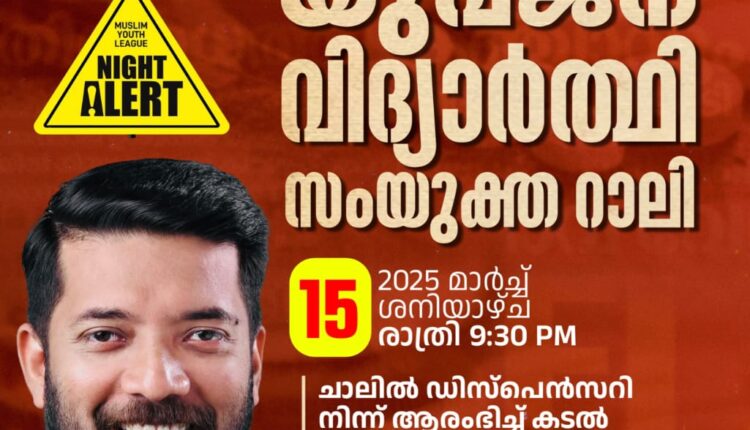 തലശ്ശേരി നിയോജക മണ്ഡലം മുസ്ലിം യൂത്ത് ലീഗ് [ എം. വൈ. എൽ ] , മുസ്ലിം സ്റ്റുഡൻ്റ്സ് ഫെഡറേഷൻ (എം. എസ്. എഫ് ] എന്നിവയുടെ സംയുക്താഭിമുഖ്യത്തിൽ, ലഹരിക്കെതിരെ യുദ്ധം എന്ന പരിപാടിയുടെ ഭാഗമായി , ലഹരി മാഫിയക്കെതിരെ ഉറക്കം നടിക്കുന്ന സർക്കാരിനെതിരെ തലശ്ശേരിയിൽ നൈറ്റ് അലേർട്ട് റാലി സംഘടിപ്പിക്കുന്നു. 15 ന് ശനിയാഴ്ച രാത്രി 9.30 ന് ചാലിൽ നിന്നും ആരംഭിച്ച് കടൽപ്പാലത്തിന് സമീപം റാലി സമാപിക്കും. വടകര എം.പി. ഷാഫി പറമ്പിൽ റാലിയിൽ പങ്കെടുക്കും.