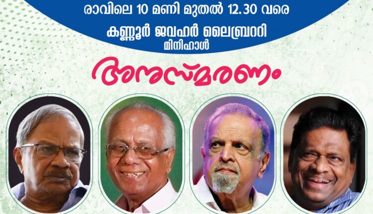 കണ്ണൂർ : കണ്ണൂർ ആസ്ഥാനമായി പ്രവർത്തിക്കുന്ന അദ്ധ്യാപക സുഹൃദ് വേദി എന്ന സാംസ്കാരിക സംഘത്തിൻ്റെ പ്രതിമാസ സംഗമവും അനുസ്മരണ പരിപാടിയും 20 ന് വ്യാഴാഴ്ച രാവിലെ 10 മണിക്ക് കണ്ണൂർ ജവഹർ ലൈബ്രററി മിനി ഹാളിൽ നടക്കും.
