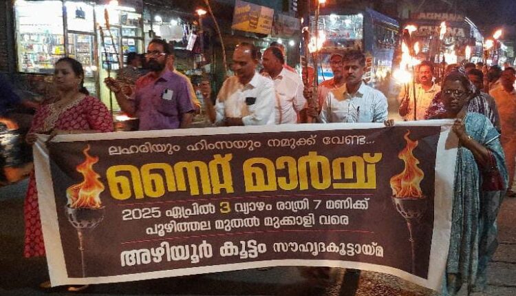 അഴിയൂരിലെ യുവ തലമുറയെയും വിദ്യാർത്ഥികളെയും ലഹരി മാഫിയയുടെ കെണിയിൽ നിന്നും രക്ഷിക്കാനും കക്ഷി രാഷ്ട്രീയത്തിനതീതമായി അഴിയൂരിൻ്റെ വികസനം ലക്ഷ്യം വെച്ച് പ്രവർത്തിച്ചു വരുന്ന സാമൂഹ്യ സാംസ്കാരിക രാഷ്ട്രീയരംഗങ്ങളിലെ പ്രമുഖരുടെ കൂട്ടായ്മയായ “അഴിയൂർക്കൂട്ടം സൗഹൃദ കൂട്ടായ്മ”യുടെ നേതൃത്വത്തിൽ പൂഴിത്തല മുതൽ കുഞ്ഞിപ്പള്ളി ടൗൺ വരെ നൈറ്റ് മാർച്ചും ശേഷം ലഹരി വിരുദ്ധ പ്രതിജ്ഞയും സംഘടിപ്പിച്ചു.