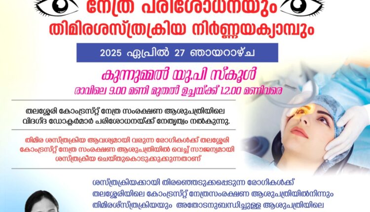 പാനൂർ : സേവാഭാരതി പന്ന്യന്നൂർ പഞ്ചായത്ത് സമിതിയുടെയും കോം ട്രസ്റ്റ് ഐ ഹോസ്പിറ്റലിൻ്റെയും സംയുക്താഭിമുഖ്യത്തിൽ സൗജന്യ നേത്ര പരിശോധനയും തിമിര ശസ്ത്രക്രിയ നിർണയ ക്യാമ്പും ഏപ്രിൽ 27ന് കുന്നുമ്മൽ യു.പി. സ്കൂളിൽ വെച്ച് നടക്കുന്നതാണ്.