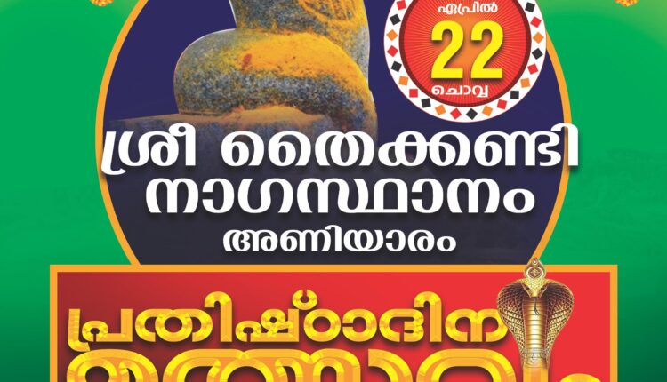 അണിയാരം തൈക്കണ്ടി നാഗസ്ഥാനം പ്രതിഷ്ഠാദിന ഉത്സവം പാതിരാകുന്നത്ത് മന ശങ്കരൻ നമ്പൂതിരിപ്പാടിന്റെ മുഖ്യകാർമികത്വത്തിൽ 22ന് ചൊവ്വാഴ്ച നടക്കുന്നതാണ്.