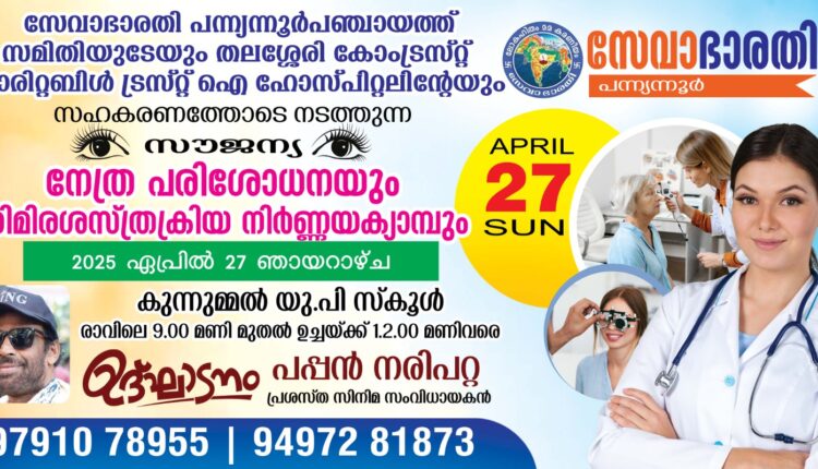പാനൂർ: സേവാഭാരതി പന്ന്യന്നൂർ പഞ്ചായത്ത് സമിതിയുടെയും കോം ട്രസ്റ്റ് ഐ ഹോസ്പിറ്റലിൻ്റെയും സംയുക്താഭിമുഖ്യത്തിൽ സൗജന്യ നേത്ര പരിശോധനയും തിമിര ശസ്ത്രക്രിയ നിർണയ ക്യാമ്പും ഏപ്രിൽ 27ന് കുന്നുമ്മൽ യുപി സ്കൂളിൽ വെച്ച് നടക്കുന്നതാണ്.സിനിമാ സംവിധായകൻ പപ്പൻ നരിപ്പറ്റ ക്യാമ്പ് ഉദ്ഘാടനം ചെയ്യും. ക്യാമ്പ് രാവിലെ 9 മണിക്ക് ആരംഭിക്കും. ശസ്ത്രക്രിയ ആവശ്യമായി വരുന്ന രോഗികൾക്ക് സൗജന്യമായി ചെയ്തു കൊടുക്കുന്നതാണ്. ഫോൺ: 9497281873.