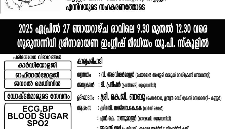 പാനൂർ : ഇന്ത്യൻ റെഡ് ക്രോസ്സ് സൊസൈറ്റി, പാനൂർ ഗുരുസന്നിധി, വള്ളങ്ങാട് ഏകലവ്യ ആർട്ട്സ് & സ്പോർട്ട്സ് ക്ലബ്ബ് എന്നിവയുടെ നേതൃത്വത്തിൽ കണ്ണൂർ ആസ്റ്റർ മിംസ് ഹോസ്പിറ്റൽ സഹകരണത്തോടെ 27 ഞായർ രാവിലെ 9 -30 മുതൽ പാനൂർ ഗുരു സന്നിധി ശ്രീനാരായണ ഇംഗ്ലീഷ് മീഡിയം യു. പി. സ്കൂളിൽ വെച്ച് സൗജന്യ മെഗാ മെഡിക്കൽ ക്യാമ്പ് നടക്കുന്നതാണ്. റെഡ് ക്രോസ്സ് സൊസൈറ്റി ചെയർമാൻ കെ. ജി. ബാബു ഉദ്ഘാടന കർമ്മം നിർവഹിക്കും. സൗജന്യ ടെസ്റ്റ്, സൗജന്യ മരുന്ന് വിതരണം എന്നിവ ഉണ്ടാകും.ഫോൺ: 9496453105.