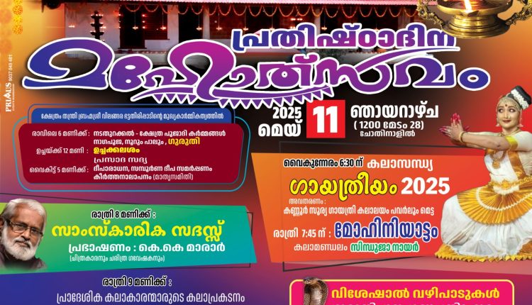 വൈകിട്ട് 6 മണിക്ക് രംഗപൂജയോടെ കലാസന്ധ്യ ആരംഭിക്കും. രാത്രി 7 മണിക്ക് പവർലൂംമെട്ട സൂര്യഗായത്രി കലാലയം അവതരിപ്പിക്കുന്ന ഗായത്രീയം 2025 , നൃത്തനൃത്യങ്ങളുടെ അവതരണവും കലാമണ്ഡലം സിന്ധുജ നായരുടെ മോഹിനിയാട്ടവും നടക്കും.