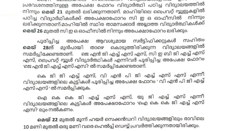മാഹി മേഖലയിലെ ഗവൺമെൻറ് വിദ്യാലയങ്ങളിലെ പ്ലസ് വൺ പ്രവേശനത്തിനുള്ള അപേക്ഷ ഫോറം വിദ്യാർത്ഥി പഠിച്ച വിദ്യാലയത്തിൽ നിന്നും മെയ് 21 മുതൽ ലഭിക്കുന്നതാണ്. മാഹിയിലെ പ്രൈവറ്റ് സ്കൂളുകളിൽ പഠിച്ച വിദ്യാർഥികൾക്ക് അപേക്ഷാഫോറം സി ഇ ഒ ഓഫീസിൽ നിന്നും ലഭിക്കുന്നതാണ്.മാഹിയിൽ സ്ഥിര താമസക്കാർ അല്ലാത്ത വിദ്യാർത്ഥികൾക്ക് മെയ് 26 മുതൽ സി ഇ ഒ ഓഫീസിൽ നിന്നും അപേക്ഷാഫോറം ലഭിക്കും.