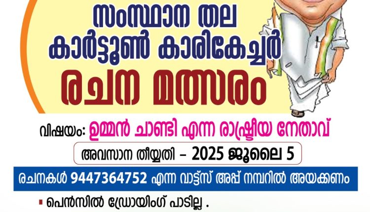 തലശ്ശേരി : ജവഹർ കൾച്ചറൽ ഫോറത്തിൻ്റെ ആഭിമുഖ്യത്തിൽ ഉമ്മൻ ചാണ്ടി അനുസ്മരണത്തിൻ്റെ ഭാഗമായി സംസ്ഥാന തല കാർട്ടൂൺ കാരിക്കേച്ചർ രചന മത്സരം സംഘടിപ്പിക്കുന്നു.