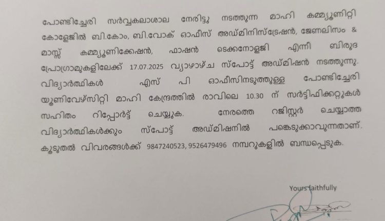 പോണ്ടിച്ചേരി സർവ്വകലാശാല നേരിട്ടു നടത്തുന്ന മാഹി കമ്മ്യൂണിറ്റി കോളേജിൽ ബി.കോം, ബി.വോക് ഓഫീസ് അഡ്മിനിസ്ട്രേഷൻ, ജേണലിസം & മാസ്സ് കമ്മ്യൂണിക്കേഷൻ, ഫാഷൻ ടെക്കനോളജി എന്നീ ബിരുദ പ്രോഗ്രാമുകളിലേക്ക് ജൂലൈ 17 ന് സ്പോട്ട് അഡ്മിഷൻ നടത്തുന്നു. വിദ്യാർത്ഥികൾ മാഹി സെമിത്തേരി റോഡിൽ എസ്.പി ഓഫീസിനടുത്തുള്ള പോണ്ടിച്ചേരി യൂണിവേഴ്സിറ്റി മാഹി സെൻ്ററിൽ രാവിലെ 10.30 ന് സർട്ടിഫിക്കറ്റുകൾ സഹിതം റിപ്പോർട്ട് ചെയ്യുക. നേരത്തെ അഡ്മിഷനിൽ റജിസ്റ്റർ ചെയ്യാത്ത