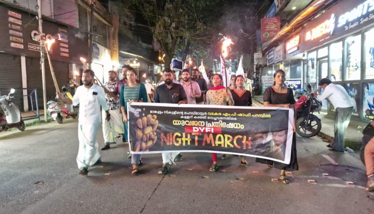 രാഹുൽ മങ്കൂട്ടത്തിൻ്റെ എല്ലാ നെറികേടിനും കൂട്ടുനിൽക്കുന്ന വടകര എംപി ഷാഫി പറമ്പിലിൻ്റെ നിലപാടിനെതിരെ ഡിവൈഎഫ്ഐ കൂത്തുപറമ്പ് മണ്ഡലം കമ്മിറ്റിയുടെ നേതൃത്വത്തിൽ യുവജന പ്രതിഷേധം; നൈറ്റ് മാർച്ച് നടത്തി. രാജു മാസ്റ്റർ സ്മാരക മന്ദിരം കേന്ദ്രീകരിച്ചു നടന്ന മാർച്ച് ബസ്റ്റാൻ്റിൽ സമാപിച്ചു. ഡിവൈഎഫ്ഐ ജില്ലാ കമ്മിറ്റിയംഗം ആരതി സനീഷ് അധ്യക്ഷയായി. ജില്ലാ സെക്രട്ടറി യേറ്റംഗങ്ങളായ കിരൺ കരുണാകരൻ, വി. ഷിജിത്ത്, ജില്ലാ കമ്മിറ്റിയംഗങ്ങളായ കെ. ഷിബിന, ടി. മിഥുൻ എന്നിവർ സംസാരിച്ചു.
