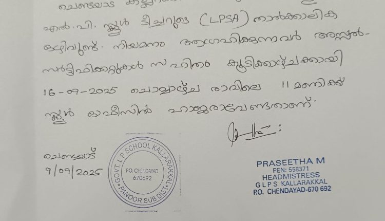 പാനൂർ : ചെണ്ടയാട് കല്ലറക്കൽ ഗവ . എൽ പി സ്കൂളിൽ എൽപിഎസ്എ തസ്തികയിൽ ഒരു താലക്കാലിക അദ്ധ്യാപക ഒഴിവുണ്ട്. കൂടിക്കാഴ്ച 16 ന് ചൊവ്വാഴ്ച രാവിലെ 11 മണിക്ക് സ്കൂൾ ഓഫീസിൽ നടക്കും. താല്പര്യമുള്ള ഉദ്യോഗാർത്ഥികൾ യോഗ്യതാ സാക്ഷ്യപത്രങ്ങളുമായി മുഖാമുഖത്തിന് ഹാജരാകേണ്ടതാണ്.