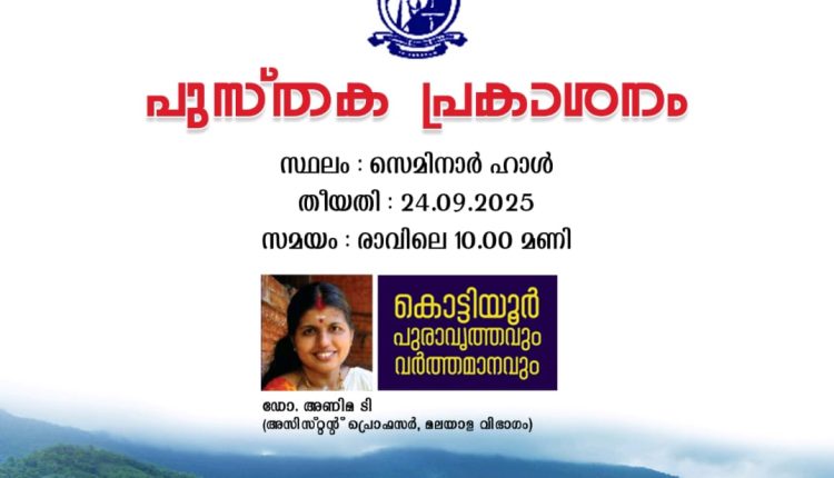 തിരുവനന്തപുരം മഹാത്മാഗാന്ധി കോളേജ് മലയാള വിഭാഗം അസിസ്റ്റൻറ് പ്രൊഫസർ ഡോ. ടി. അണിമ രചിച്ച കൊട്ടിയൂർ പുരാവൃത്തവും വർത്തമാനവും എന്ന ഗ്രന്ഥത്തിന്റെ പ്രകാശന കർമ്മം കോളേജ് സെമിനാർ ഹാളിൽ വച്ച് 24ന് ബുധൻ കാലത്ത് 10 മണിക്ക് നടക്കുന്നതാണ്.ചരിത്ര ഗവേഷകൻ ഡോ. എം ജി ശശിഭൂഷൻ പ്രകാശന കർമ്മം നിർവഹിക്കും.ചടങ്ങിൽ കോളേജ് പ്രിൻസിപ്പൽ ഡോ. വി. എം. ആനന്ദകുമാർ അധ്യക്ഷത വഹിക്കും.ഡോ. അജയപുരം ജ്യോതിഷ് കുമാർ പുസ്തക പരിചയം നടത്തും. ഡോ. എം. രാജീവ് കുമാർ, ഡോ. വി.എസ് ചിത്ര, ഡോ.ആർ.ഐ. ആശ എന്നിവർ പ്രസംഗിക്കും. ഡോ. ടി. അണിമ ചൊക്ളി നിടുമ്പ്രം സ്വദേശിനിയാണ് .