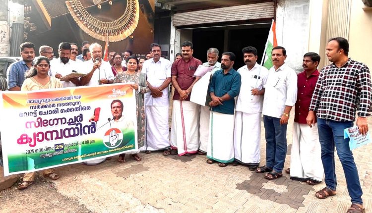 തെരഞ്ഞെടുപ്പ് കമ്മീഷണറെ കൂട്ടുപിടിച്ച് കൊണ്ട് ബി ജെ പി സർക്കാർ നടത്തുന്ന വോട്ട് ചോരിക്കെതിരെ രാഹുൽ ഗാന്ധി നയിക്കുന്ന പോരാട്ടങ്ങൾക്ക് കരുത്തു പകർന്നു കൊണ്ട് രാജ്യവ്യാപകമായി നടക്കുന്ന സിഗ് നേച്ചർ കേമ്പയിൽ പാനൂർ ബ്ലോക്ക്, പാനൂർ മണ്ഡലം കോൺഗ്രസ് കമ്മിറ്റികളുടെ നേതൃത്വത്തിൽ പാനൂരിൽ നടന്നു. പുത്തൂർ റോഡ് ബസ്സ്റ്റോപ്പിന് സമീപം നടന്ന സിഗ്നേച്ചർ കാംപയിൽ കെ പി സി സി മെമ്പർ വി സുരേന്ദ്രൻ മാസ്റ്റർ ഉദ്ഘാടനം ചെയ്തു.. പാനൂർ ബ്ലോക്ക് കോൺഗ്രസ് പ്രസിഡണ്ട് കെ പി രാമചന്ദ്രൻ അധ്യക്ഷത വഹിച്ചു. ഡി സി സി സെക്രട്ടറിമാരായ സന്തോഷ് കണ്ണം വെള്ളി, കെ പി സാജു, തേജസ് മുകുന്ദ്, കെ രമേശൻ, സി വി എ ജലീൽ,