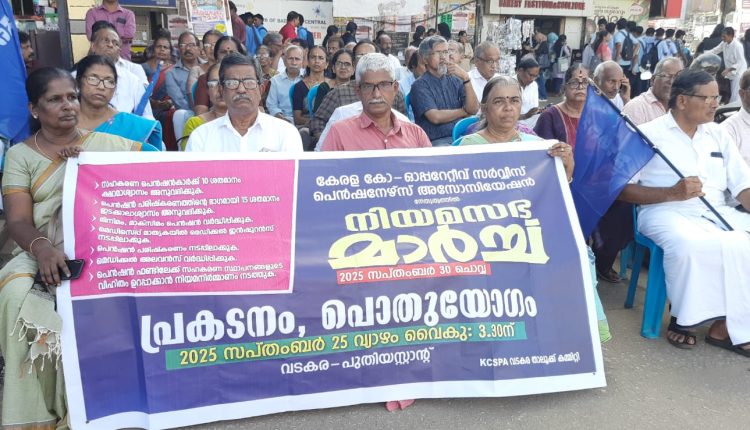 കേരളത്തിലെ സഹകരണ സ്ഥാപനങ്ങളിൽ നിന്നും വിരമിച്ചവരുടെ സംഘടനയായ KCSPA യുടെ നേതൃത്വത്തിൽ വടകരയിൽ പ്രതിഷേധ പ്രകടനവും പൊതുയോഗവും സംഘടിപ്പിച്ചു.