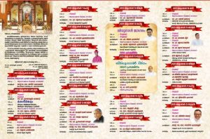 6 ന് തിങ്കളാഴ്ച്ച ഫാ.സനൽ ലോറൻസ്, 7 ന് ചൊവ്വാഴ്ച്ച ഫാ. ജോസഫ് കൊട്ടിയത്ത്, 8 ന് ബുധനാഴ്ച്ച ഫാ.മാർട്ടിൻ ഇലഞ്ഞിപ്പറമ്പിൽ, 9 ന് കോട്ടപ്പുറം രൂപതാ മെത്രാൻ ഡോ.അംബ്രോസ് പുത്തൻ വീട്ടിൽ, ’10 ന് വെള്ളിയാഴ്ച്ച ഫാ.ഡേവിഡ് സഹായ രാജ് എസ്, 11 ന് ഫാ.ആൻസിൽ പീറ്റർ, 12 ന് ഞായറാഴ്ച്ച കണ്ണുർ രൂപത മെത്രാൻ റവ.ഡോ.അലക്സ് വടക്കുംതല, 13 ന് തിങ്കളാഴ്ച്ച ഫാ.ജോൺസൺ അവരേവ എന്നിവരുടെ കാർമ്മികത്വത്തിൽ ദിവ്യബലി അർപ്പിക്കും,