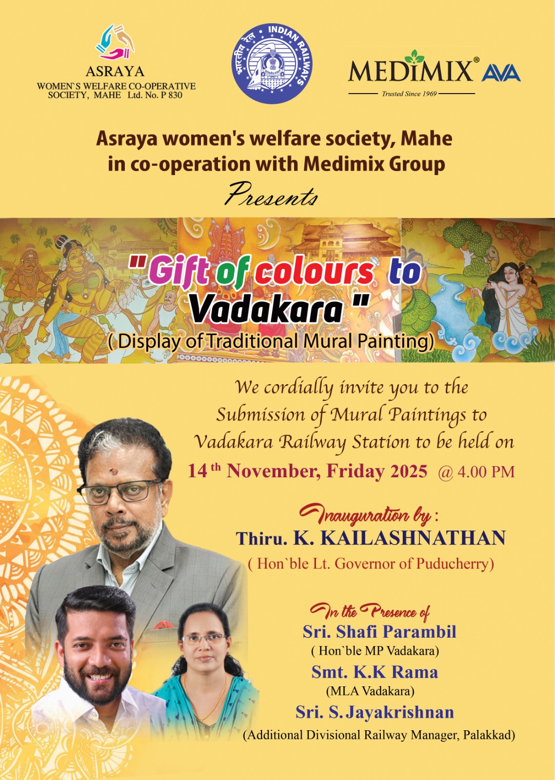മാഹി പന്തക്കലിലെ ആശ്രയ വിമൻസ് കോ-ഓപ് സൊസൈറ്റിയിലെ ചിത്രകാരികൾ വരച്ച ചുമർ ചിത്രങ്ങൾ പുതുച്ചേരി ലഫ്. ഗവർണർ കെ. കൈലാസനാഥൻ നാടിന് സമർപ്പിക്കും. 14 ന് വൈകുന്നേരം 4 ന് നടക്കുന്ന ചടങ്ങിൽ എം.എൽ.എമാരായ ഷാഫി പറമ്പിലും കെ.കെ.രമയും സംബന്ധിക്കും.