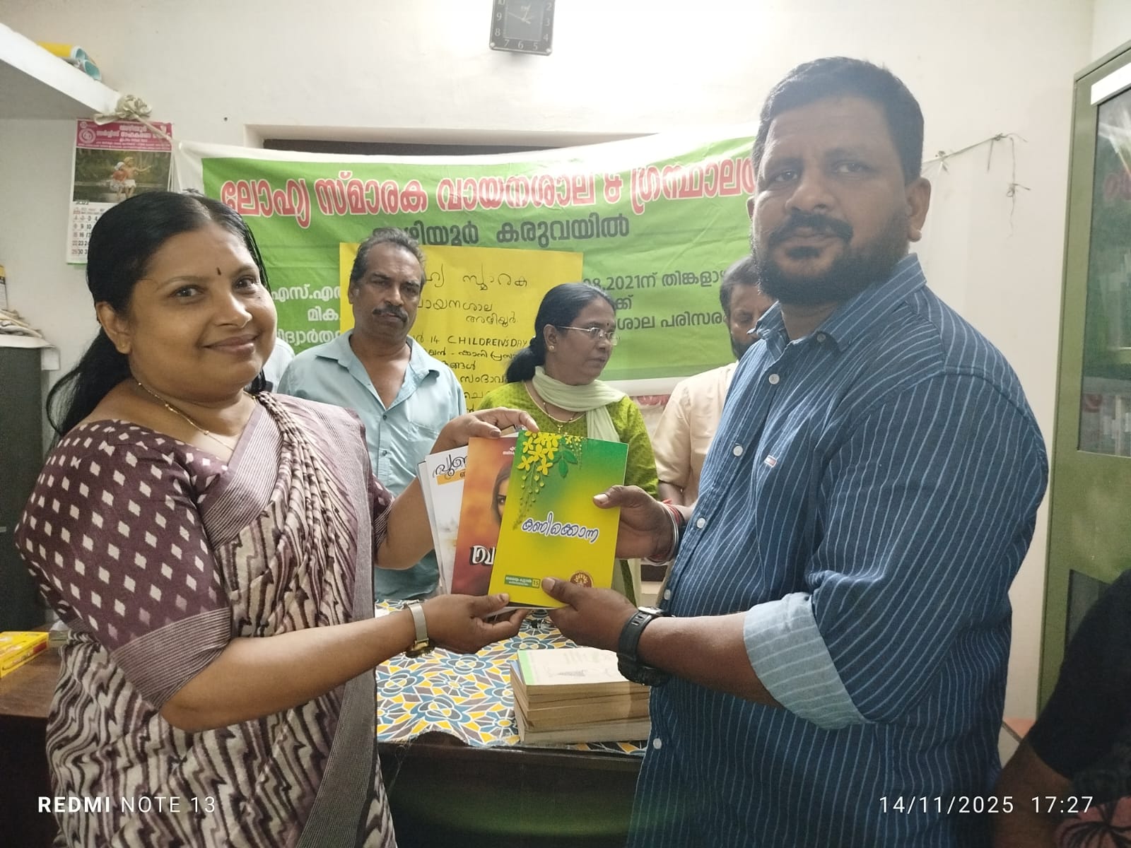 നവംബർ 14 ന് ശിശുദിനത്തോട് അനുബന്ധിച്ച് പുസ്തകങ്ങൾ വായനശാലക്കു സംഭാവന ചെയ്തു. വായനശാല സെക്രട്ടറി ജിംലേഷ് സ്വാഗതം പറഞ്ഞു. വനിതവേദി പ്രസിഡന്റ് മാലതി കൃഷ്ണൻ അധ്യക്ഷ സ്ഥാനം നിർവഹിച്ചു. വി. പി. ജയൻ ( മുൻ പഞ്ചായത്ത് പ്രസിഡന്റും വായനശാല രക്ഷധികാരി യുമായ)..പരിപാടി ഉദ്ഘാടനം ചെയ്തു. ഷാനി പ്രസാദ് ( വായനശാല വനിതാവേദി സെക്രട്ടറി). വി.പി ജയന്റെ പത്നി ഷീജ എന്നിവർ പുസ്തകങ്ങൾ വായന ശാലക്ക് കൈമാറി.. കുട്ടികൾക്ക് ഉപകാരപ്രദമാകുന്ന ഇംഗ്ലീഷ് സ്റ്റോറി, കവിത സമാഹാരങ്ങൾ, പിന്നെ മറ്റു വിഞാനപ്രദമായ പുസ്തകങ്ങൾ നൽകി. വായനശാല സെക്രട്ടറി ജിംലേഷ് പുസ്തകങ്ങൾ സ്വീകരിച്ചു.