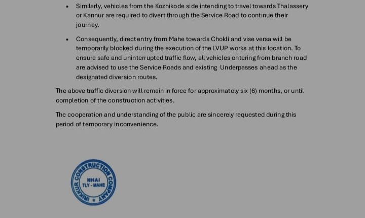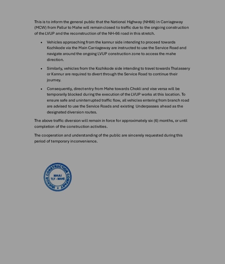 തലശ്ശേരി മാഹി ബൈപ്പാസിലെ അടിപ്പാത നിർമ്മാണം: ഗതാഗത നിയന്ത്രണം (പള്ളൂർ മുതൽ മാഹി വരെയുള്ള കാരേജ്വേയിലെ ദേശീയപാത അടച്ചിടും)