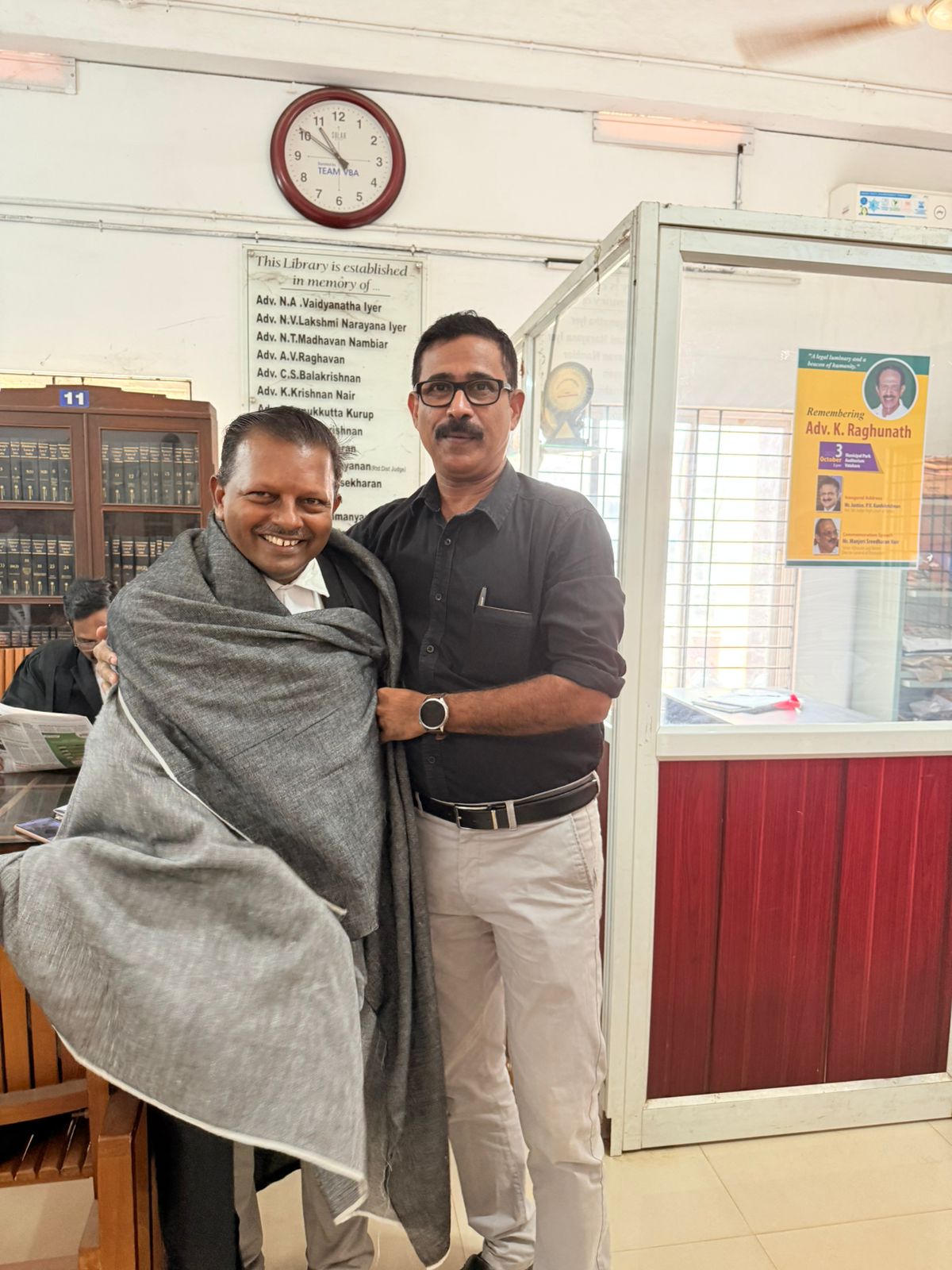 ചിത്ര വിവരണം : അഡ്വക്കേറ്റ് എ. എം സന്തേഷ് കുമാറിനെ ഷാഹുൽ ഹമീദ് ആദരിക്കുന്നു.
