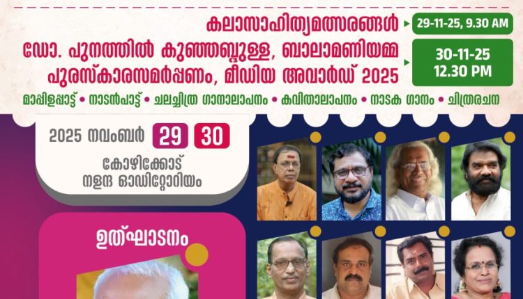 കോഴിക്കോട്: കാലാനിധി സെന്റര് ഫോര് ഇന്ത്യന് ആര്ട്സ് ആന്റ് ഹെറിറ്റേജ് ട്രസ്റ്റിന്റെ സില്വര് ജൂബിലി ആഘോഷത്തിന്റെ ഭാഗമായി 2025 നവംബര് 29, 30 തീയതികളില് കോഴിക്കോട് നളന്ദ ഓഡിറ്റോറിയത്തില് കാലാനിധി ഇശാല്രാവും പുരസ്കാര സമര്പ്പണവും നടക്കും.
