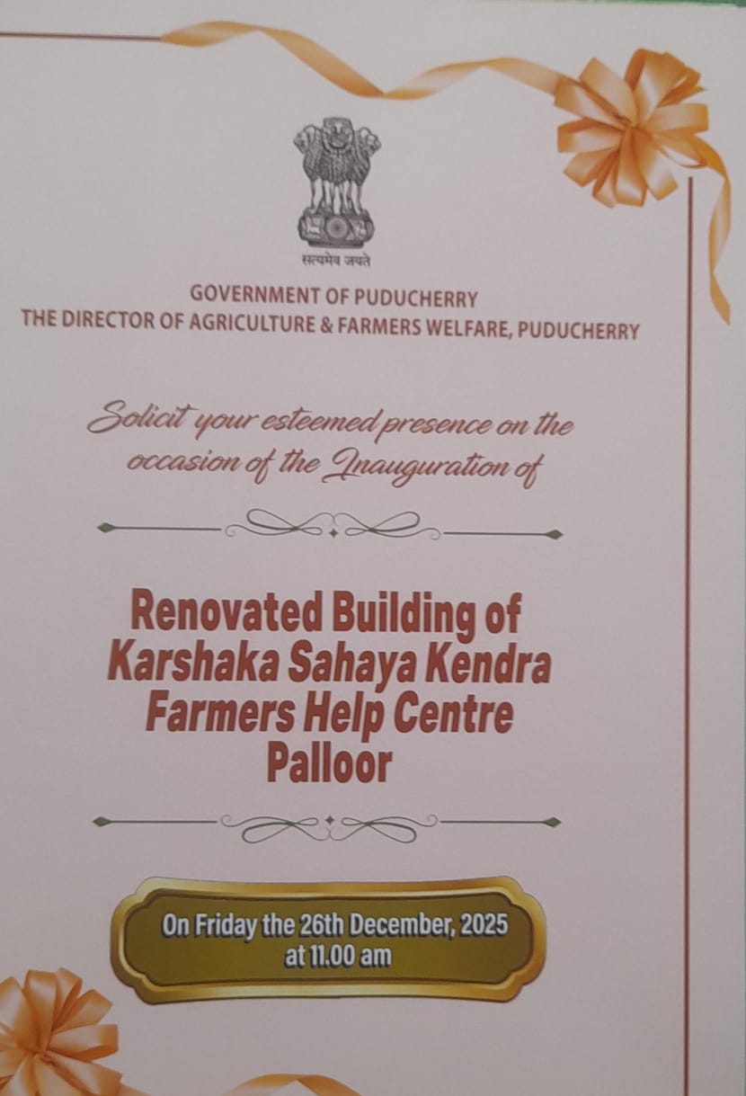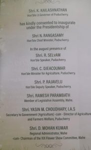 മുഖ്യമന്ത്രി ശ്രീ. എൻ. രംഗസാമി അധ്യക്ഷത വഹിക്കും. സ്പീക്കർ ആർ. സെൽവം, കൃഷി വകുപ്പ് മന്ത്രി തേനി ജയകുമാർ, ഡപ്യൂട്ടി സ്പീക്കർ പി. രാജവേലു, ശ്രീ. രമേഷ് പറമ്പത്ത് എം.എൽ എ, ശ്രീ. യാസിൻ ചൗധരി ഐ.എ.എസ്. അഡ്മിനിസ്ട്രേറ്റർ ഡി. മോഹൻ കുമാർ എന്നിവർ സംബന്ധിക്കും.