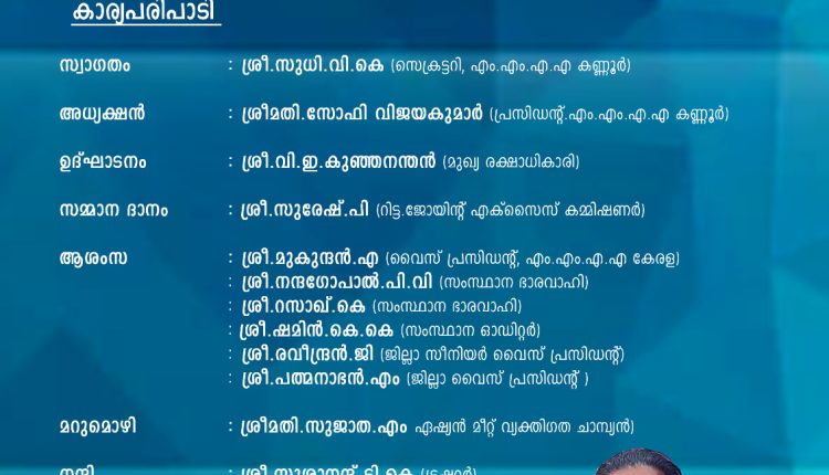 എം എം എ എ കണ്ണൂർ ജില്ല പ്രസിഡണ്ട് സോഫിയ വിജയകുമാറിൻ്റെ അദ്ധ്യക്ഷതയിൽ ചേരുന്ന സദസ്സ് വി.ഇ.കുഞ്ഞനന്തൻ ഉദ്ഘാടനം ചെയ്യും.