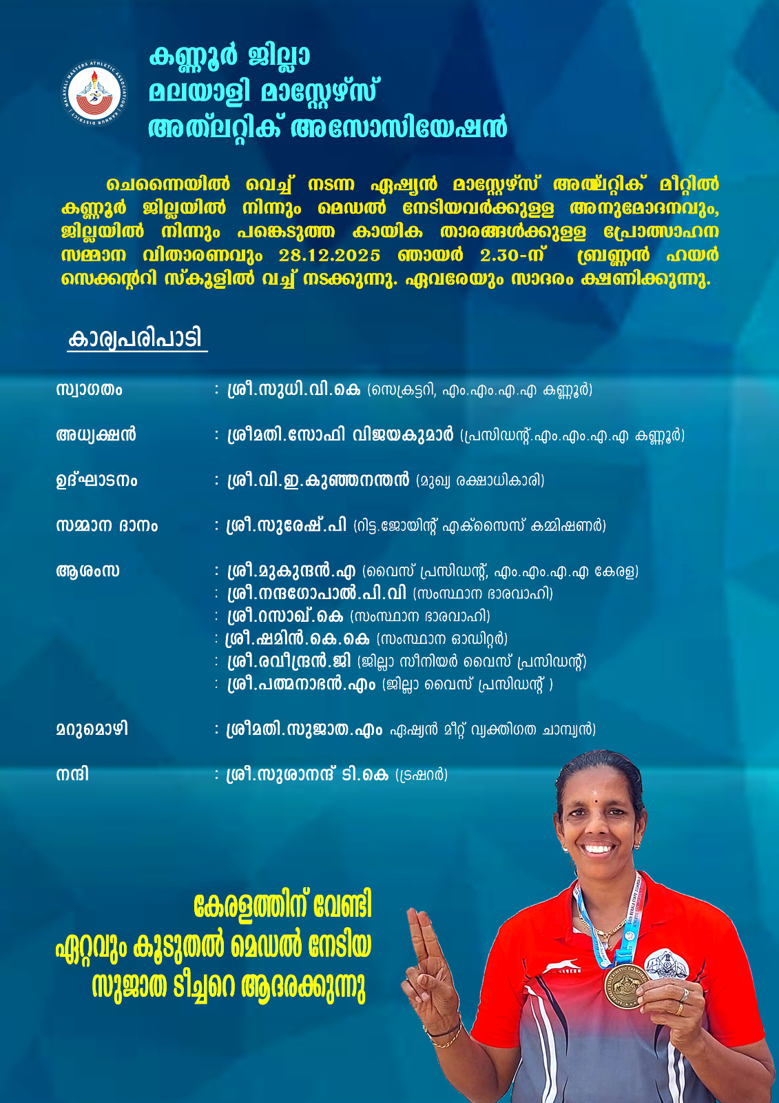 മലയാളി മാസ്റ്റേർസ് അത്ലറ്റിക്ക് അസോസിയേഷൻ കണ്ണൂർജില്ല കമ്മിറ്റിയുടെ ആഭിമുഖ്യത്തിൽ , ചെന്നൈയിൽ നടന്ന ഏഷ്യൻ മാസ്റ്റേർസ് അത് ലറ്റിക്ക് മത്സരത്തിൽ പങ്കെടുത്തവരും മെഡൽ നേടിയവരുമായ കണ്ണൂർ ജില്ലയിലെ കായികതാരങ്ങൾക്ക് അനുമോദനവും സമ്മാന വിതരണവും 28 ന് ഞായറാഴ്ച ഉച്ചക്ക് 2.30 ന് തലശ്ശേരി ഗവ. ബ്രണ്ണൻ ഹയർ സെക്കൻ്ററി സ്കൂളിൽ നടത്തും . ഏഷ്യൻ മീറ്റിൽ കേരളത്തിനായി ഏറ്റവും കൂടുതൽ മെഡൽ നേടിയ വ്യക്തിഗത ചാമ്പ്യൻ എം സുജാത ടീച്ചറെ ആദരിക്കും.