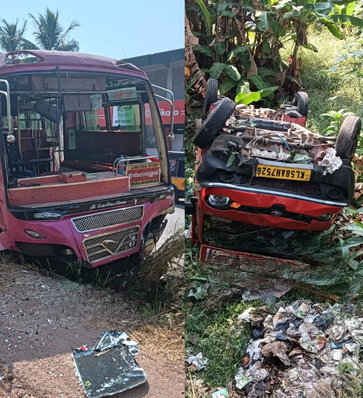 ബി കെ പ്ളൈവുഡ്സിൽ നിന്നും പ്ളൈവുഡ് ലോഡുമായി തലശ്ശേരി ഭാഗത്തേക്ക് പോകുവാനായി അശ്രദ്ധയോടെ റോഡിലേക്കിറങ്ങിയ പിക് അപ്പിന് പിറകിൽ മാഹി ഭാഗത്ത് നിന്ന് തലശ്ശേരി ഭാഗത്തേക്ക് പോവുകയായിരുന്ന ലിമിറ്റഡ് സ്റ്റോപ്പ് ബസ്സിടിക്കുകയായിരുന്നു.