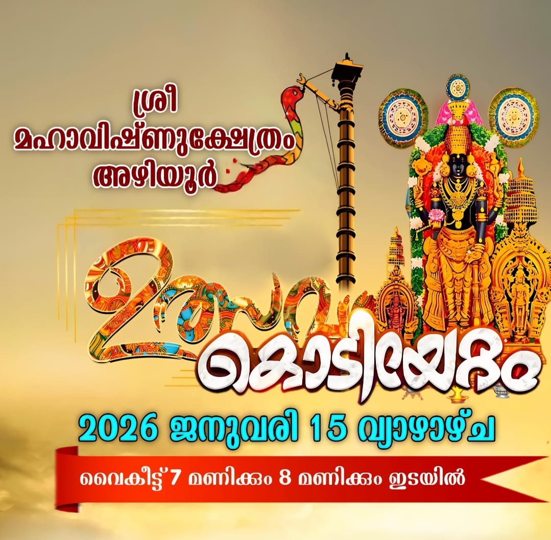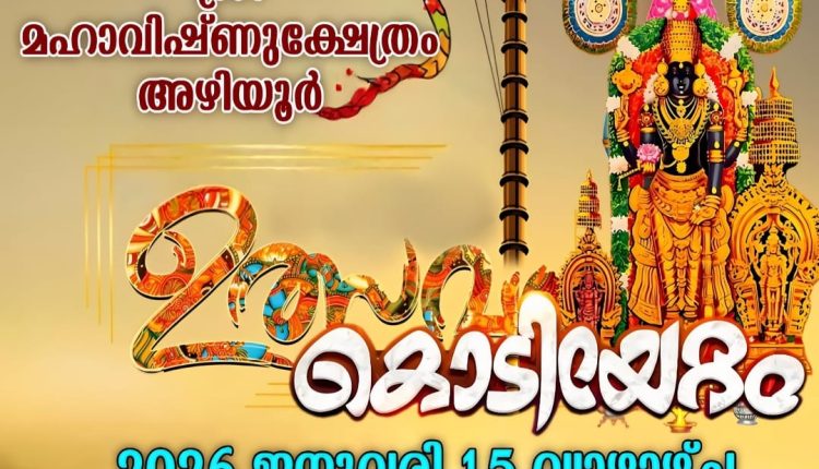 മാഹി റെയിൽവേ സ്റ്റേഷന്റെ കിഴക്കുവശത്ത് അഴിയൂരിൽ സ്ഥിതി ചെയ്യുന്ന ചിരപുരാതനമായ അഴിയൂർ ശ്രീ മഹാവിഷ്ണു ക്ഷേത്രത്തിലെ വാർഷിക മഹോത്സവത്തിന് ഇന്ന് വൈകുന്നേരം ദീപാരാധനയ്ക്ക് ശേഷം കൊടിയേറും. ക്ഷേത്രത്തിലെ ഭാഗവത സപ്താഹയജ്ഞത്തിന് 11 ന് ഞായറാഴ്ച തുടക്കമായി. തിരുവനന്തപുരത്തെ ഡോ.കെ.ഉണ്ണികൃഷ്ണൻ നമ്പൂതിരിയാണ് യഞ്ജാചാര്യൻ – 16 ന് രുഗ്മിണി സ്വയം വരഘോഷയാത്ര.18 ന് സമാപിക്കും.