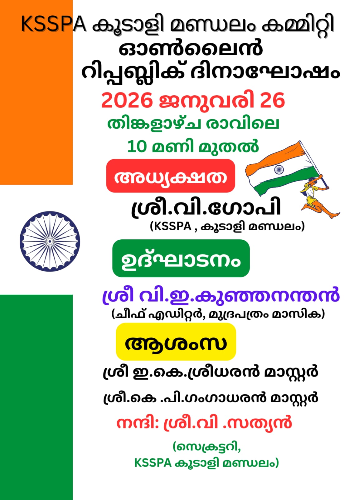 കെ എസ് എസ് പി എ കൂടാളി മണ്ഡലം കമ്മിറ്റിയുടെ നേതൃത്വത്തിൽ റിപ്പബ്ലിക്ക് ദിനാഘോഷം സംഘടിപ്പിക്കും. 26 ന് തിങ്കളാഴ്ച ആഘോഷപരിപാടിയുടെ ഭാഗമായി ഓൺലൈൻ യോഗം നടത്തും. 26 ന് തിങ്കളാഴ്ച രാവിലെ 10 മണി മുതലാണ് പരിപാടി. കൂടാളി മണ്ഡലം പ്രസിഡണ്ട് വി. ഗോപിയുടെ അദ്ധ്യക്ഷതയിൽ ചേരുന്ന റിപ്പബ്ലിക്ക് ദിന യോഗം വി.ഇ. കുഞ്ഞനന്തൻ ഉദ്ഘാടനം ചെയ്യും.