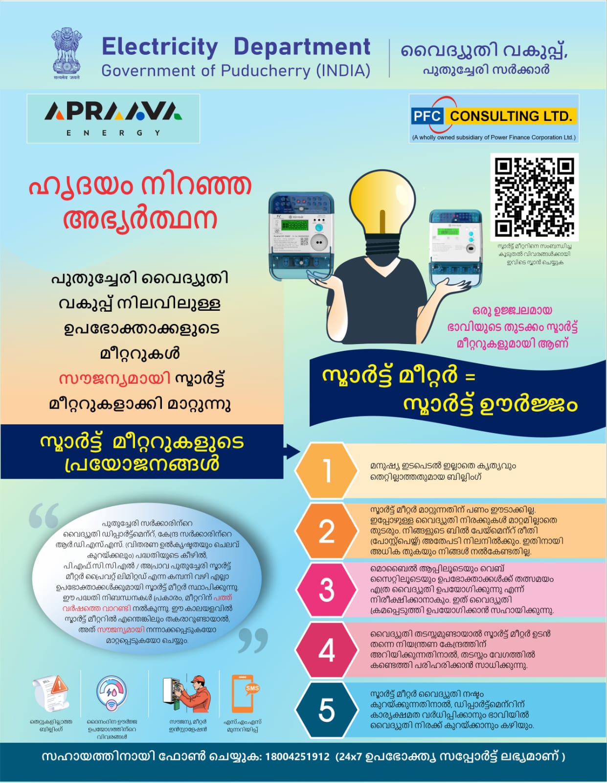 ഇതിൽ പ്രകാരം പുതുച്ചേരി ഇലക്ട്രിസിറ്റി ഡിപ്പാർട്ട്മെൻറ്ന് കീഴിൽ പഴകിയ എച്ച് ടി അലൂമിനിയം ലൈൻ മാറ്റി പുതിയ ഏരിയൽ ബെഞ്ച് കണ്ടക്ടർ മാറ്റുന്ന പദ്ധതിയും LT ലൈൻ മാറ്റുന്ന പദ്ധതിയും അതോടൊപ്പം സ്മാർട്ട് മീറ്റർ സ്ഥാപിക്കുന്ന പദ്ധതിയുമാണ് മാഹിയിൽ നടപ്പിലാക്കുന്നത് . HT അലൂമിനിയം ലൈൻ മാറ്റി എബിസി കണ്ടക്ടറാക്കി മാറ്റിയാൽ കരണ്ട് പോക്ക് വളരെയധികം കുറയ്ക്കാൻ സാധിക്കും മാഹിയിൽ ഇതിന്റെ വർക്ക് ആരംഭിച്ചിട്ടുണ്ട് പഴകിയ LT ലൈനുകൾ മാറ്റുന്ന പദ്ധതിയും വൈകാതെ നടപ്പിലാക്കുന്നു ഇതോടെ വൈദ്യുതി വിതരണം സുഖമായി തടസ്സമില്ലാതെ നൽകാൻ സാധിക്കും പ്രസരണ വിതരണ നഷ്ടവും കുറയ്ക്കാൻ സാധിക്കും.