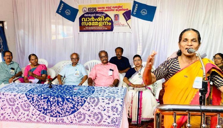സംസ്ഥാന സർക്കാർ ജീവനക്കാർക്കും പെൻഷൻകാർക്കും ഏർപ്പെടുത്തിയ മെഡിസെപ്പ് രണ്ടാംഘട്ട പദ്ധതിയിൽ ക്യാഷ് ലെസ്സ് ചികിത്സ എന്ന തത്വത്തിൽ നിന്ന് വ്യതിചലിക്കാൻ എം പാനൽചെയ്യപ്പെട്ട ആശുപത്രികളെ അനുവദിക്കരുതെന്ന് കേരള സ്റ്റേറ്റ് സർവീസ് പെൻഷനേഴ്സ് യൂണിയൻ തലശ്ശേരി ബ്ലോക്ക് സമ്മേളനം സർക്കാരിനോട് ആവശ്യപ്പെട്ടു. സമ്മേളനം കെ.എസ്.എസ്.പി.യു സംസ്ഥാന കമ്മിറ്റി അംഗം കെ.ടി. കത്രിക്കുട്ടി ടീച്ചർ ഉദ്ഘാടനം ചെയ്തു. എ. മോഹനൻ മാസ്റ്റർ അധ്യക്ഷനായിരുന്നു. സംഘാടകസമിതി ചെയർമാനും ചൊക്ലി ഗ്രാമപഞ്ചായത്ത് പ്രസിഡണ്ടുമായ എൻ. അനൂപ് സ്വാഗതം ആശംസിച്ചു.