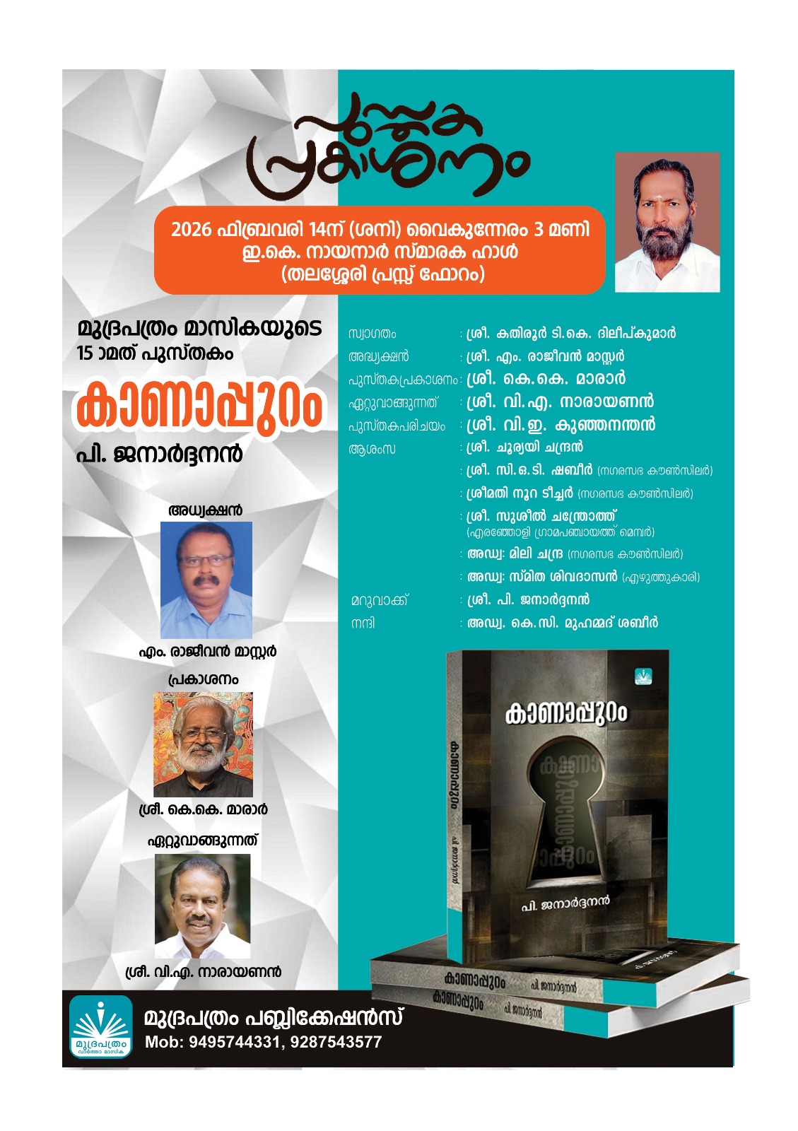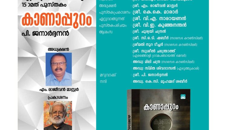 പി. ജനാർദ്ദനൻ എഴുതി മുദ്രപത്രം മാസിക പ്രസിദ്ധീകരിക്കുന്ന കാണാപ്പുറം എന്ന പുസ്തകത്തിൻ്റെ പ്രകാശനം 14 ന് ശനിയാഴ്ച തലശ്ശേരിയിൽ നടക്കും . വൈകിട്ട് 3 മണിക്ക് ഇ.കെ.നായനാർ സ്മാരക ഹാളിൽ [ പ്രസ്സ് ഫോറം ഹാൾ ] ചിത്രകാരനും ചരിത്രകാരനുമായ കെ.കെ.മാരാർ പുസ്തക പ്രകാശനം നിർവ്വഹിക്കും. എം. രാജീവൻ മാസ്റ്റുടെ അദ്ധ്യക്ഷതയിൽ നടക്കുന്ന യോഗത്തിൽ കെ.പി.സി.സി ട്രഷറർ വി.എ. നാരായണൻ പുസ്തകം ഏറ്റുവാങ്ങും. വി.ഇ. കുഞ്ഞനന്തൻ പുസ്തകപരിചയം നടത്തും.
