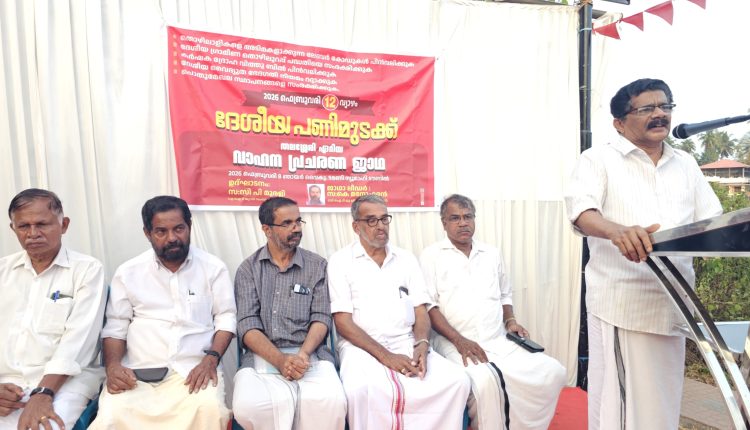 ന്യൂമാഹി : തൊഴിലാളികളെ അടിമകളാക്കുന്ന ലേബർ കോഡുകൾ പിൻവലിക്കുക, ദേശീയ ഗ്രാമീണ തൊഴിലുറപ്പ് പദ്ധതിയെ സംരക്ഷിക്കുക, കർഷക ദ്രോഹ വിത്തു ബിൽ പിൻവലിക്കുക, ദേശീയ വൈദ്യുത ഭേദഗതി നിയമം റദ്ദാക്കുക, പൊതുമേഖല സ്ഥാപനങ്ങളെ സംരക്ഷിക്കുക തുടങ്ങിയ മുദ്രാവാക്യമുയർത്തി ഫിബ്രവരി 12 ന് നടക്കുന്ന ദേശീയ പണിമുടക്കിൻ്റെ പ്രചരണാർഥം തലശ്ശേരി ഏറിയയിൽ പര്യടനം നടത്തുന്ന ട്രേഡ് യൂണിയൻ സംയുക്ത സമിതി പ്രചരണ വാഹന ജാഥ ന്യൂമാഹി ടൗണിൽ എഐടിയുസി സംസ്ഥാന സെക്രട്ടറി സി.പി. മുരളി ഉദ്ഘാടനം ചെയ്തു. എ. രമേശ് ബാബു അധ്യക്ഷത വഹിച്ചു. ജാഥ ലീഡറും സിഐടിയു ജില്ലാ ജനറൽ സെക്രട്ടറിയുമായ കെ.മനോഹരൻ, എം. ബാലൻ, എസ്.കെ വിജയൻ, വടക്കൻ ജനാർദ്ദനൻ, പി.പി. രഞ്ചിത്ത് എന്നിവർ സംസാരിച്ചു. തിങ്കളാഴ്ച ജാഥ വിവിധ കേന്ദ്രങ്ങളിലെ സ്വീകരണത്തിന് ശേഷം പൊന്ന്യം പാലം സമാപിക്കും.