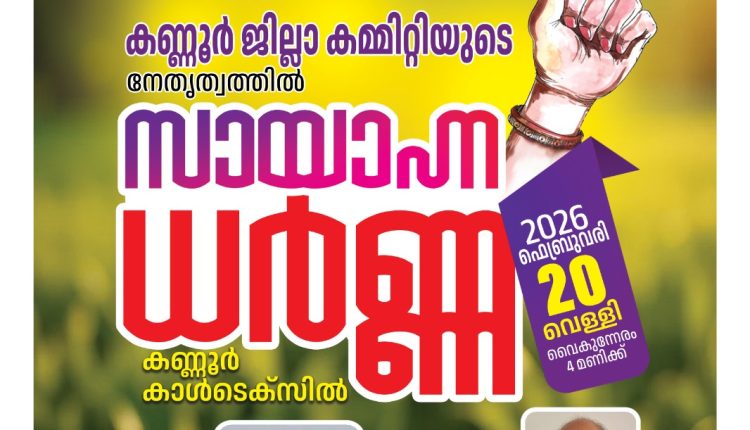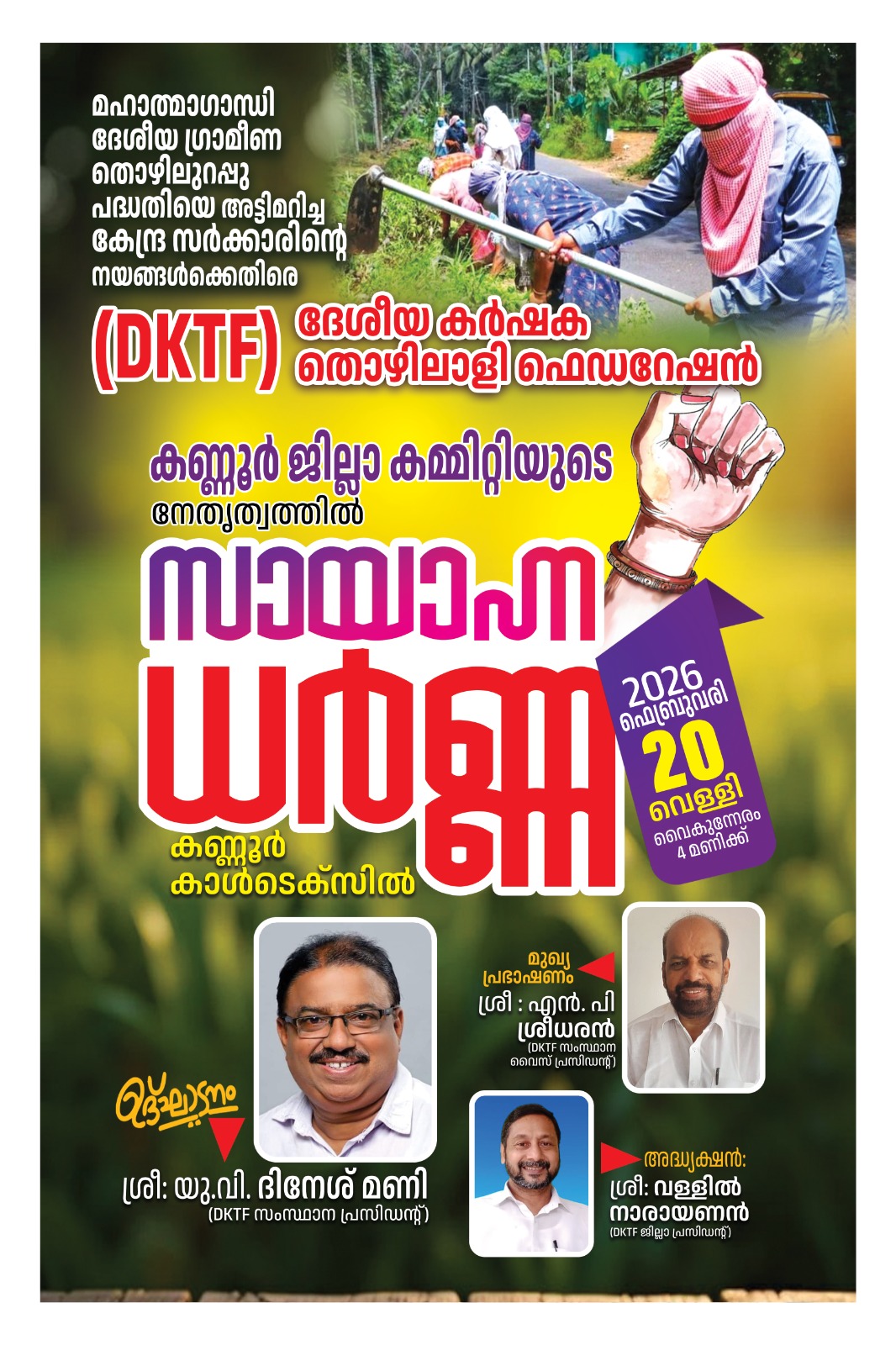 മഹാത്മാഗാന്ധി ദേശീയ തൊഴിലുറപ്പ് പദ്ധതി അട്ടിമറിച്ച കേന്ദ്രസർക്കാർ നയങ്ങൾക്കെതിരെ ദേശീയ കർഷകത്തൊഴിലാളി ഫെഡറേഷൻ [ ഡി കെ ടി എഫ് ] കണ്ണൂർ ജില്ല കമ്മിറ്റിയുടെ ആഭിമുഖ്യത്തിൽ സായാഹ്ന ധർണ്ണ സംഘടിപ്പിക്കുന്നു . 20 ന് വെള്ളിയാഴ്ച വൈകിട്ട് 4 മണിക്ക് കണ്ണൂർ കാൾടെക്സിൽ നടക്കുന്ന പ്രതിഷേധ ധർണ്ണ ഡി കെ ടി എഫ് സംസ്ഥാന പ്രസിഡണ്ട് യു . വി. ദിനേശ് മണി ഉദ്ഘാടനം ചെയ്യും . ജില്ല പ്രസിഡണ്ട് വള്ളിൽ നാരായണൻ്റെ അദ്ധ്യക്ഷതയിൽ നടത്തുന്ന ധർണ്ണാ സമരത്തിൽ സംസ്ഥാന വൈസ് പ്രസിഡണ്ട് എൻ. പി. ശ്രീധരൻ മുഖ്യ പ്രഭാഷണം നടത്തും.